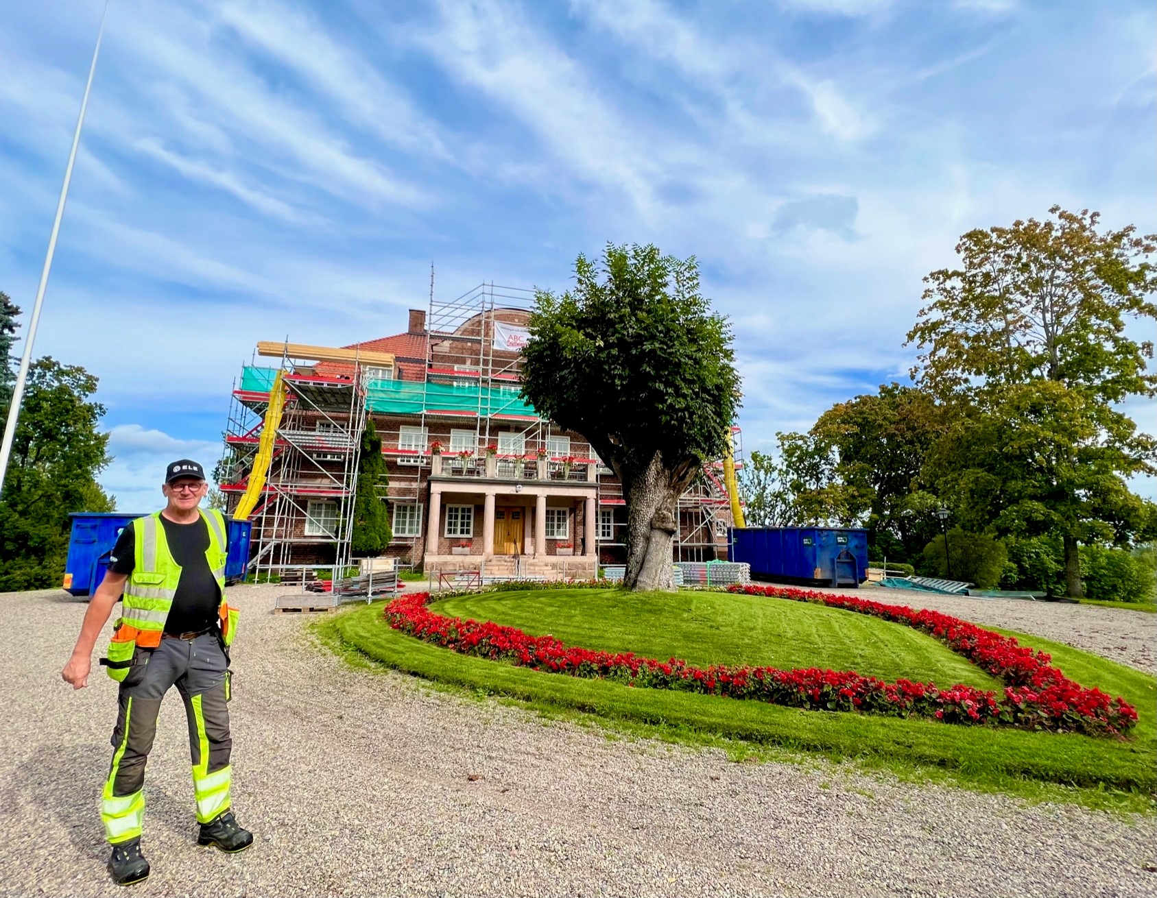 Tegelvillan Carlslund vid ELE i Kilafors genomgår just nu en yttre renovering och på vardagarna rör sig snickare, plåtslagare och målare uppe på byggställningen som omger villan.