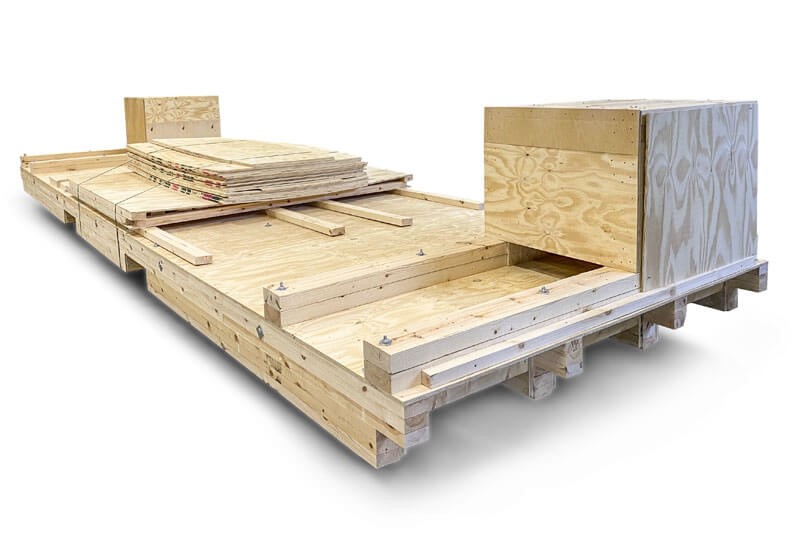 Vi tillverkar lådor för över 50ton och kan bygga dessa på plats hos kund eller leverera som platta paket.